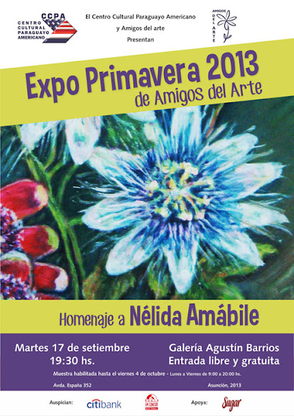 El Centro Cultural Paraguayo Americano (CCPA) y Amigos del Arte inauguran el martes 17 de septiembre a las 19:30 hs., la Expo Primavera 2013 de Amigos del Arte en "Homenaje a Nélida Amábile", quien fuera socia activa de la entidad, en la Galería Agustín Barrios del Centro Cultural Paraguayo Americano (Av. España 352). En esta exposición participan 33 expositores, socios de la entidad, donde cada uno expone lo más característico de su producción artística en una variedad de estilos y técnicas. La muestra podrá visitarse hasta el viernes 4 de octubre en horario de 9 a 20 hs.