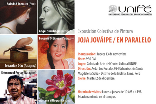 El día jueves 13 de noviembre se inaugura la exposición grupal titulada "Joja jováipe (En Paralelo)" en la galería del Centro Cultural UNIFE de la Universidad Femenina del Sagrado Corazón, Lima, Perú. Para la muestra fueron especialmente invitados por los artistas peruanos Angel Surichaqui Ramos y Soledad Tomairo Gabriel (Integrantes de la Sociedad Figurativa de ese país), los artistas Sebastián Díaz, Eugenia Ortigoza, Emmanuel Fretes y Adriana Villagra quienes conforman el grupo "Neo-Realistas.py". Esta muestra cuenta con el apoyo de la Dirección de Relaciones Culturales y Turismo de la Cancillería Nacional del Paraguay.