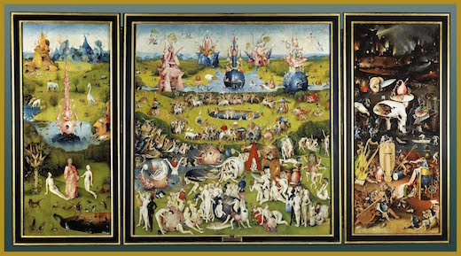 | El Jardín de las Delicias, El Bosco. Hacia 1500-1510, 220 x 389 cm. Colección Museo del Prado. |