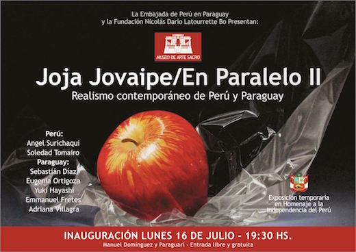 La Embajada del Perú en el Paraguay y el Museo de Arte Sacro de Asunción presentaron la muestra grupal titulada “Joja jováipe II (En Paralelo)” del grupo Neo-Realistas.py con la participación de los artistas peruanos invitados Angel Surichaqui y Soledad Tomairo. La inauguración oficial fue el lunes 16 de julio a las 19:30 hs. en la sala de exposiciones temporales del Museo de Arte Sacro (Manuel Domínguez y Paraguarí, Asunción) en el marco de la celebración de las Fiestas Patrias del Perú organizada por la Embajada del Perú en el Paraguay.Esta muestra es parte de una serie de intercambios artísticos que tiene como objetivo afianzar y difundir la pintura realista en el escenario del arte contemporáneo latinoamericano y universal. Este proyecto expositivo tuvo su primera edición en noviembre del 2014, cuando los integrantes del grupo Neo-Realistas.py fuimos invitados por los artistas peruanos Angel Surichaqui y Soledad Tomairo a exponer en la galería de la Universidad Femenina del Sagrado Corazón (UNIFE) de Lima, Perú.